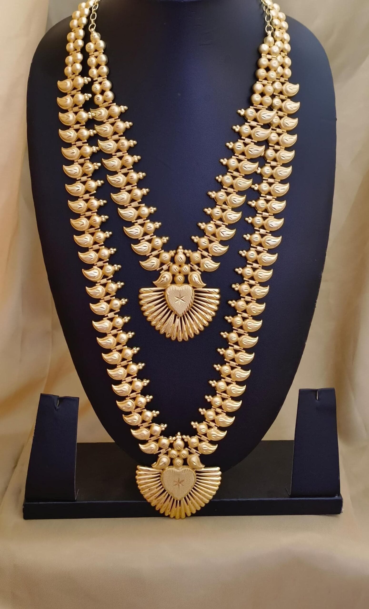 Experience real elegance with this luxury micro plated haram combo, crafted with detailed mango motifs and heart-shaped pendant with radiant sunburst detailing make ideal for pairing with silk sarees & ethnic wears.